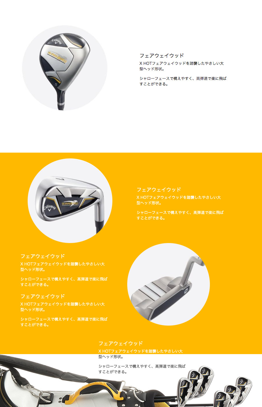番手:W#1/W#5/I#5/I#6/I#7/I#8/I#9/PW/SW/PT ロフト角:W#1:10.5度/W#5:19.0度/I#5:23.0度/I#6:26.0度/I#7:30.0度/I#8:34.5度/I#9:39.0度/PW:44.0度/SW:54.0度/PT:3.0度/ ライ角:W#1:58.5度/W#5:58.0度/I#5:61.5度/I#6:62.0度/I#7:62.5度/I#8:63.0度/I#9:63.5度/PW:64.0度/SW:64.0度/PT:70.0度/ クラブ長さ:W#1:45.0インチ/W#5:42.5インチ/I#5:37.8インチ/I#6:37.25インチ/I#7:36.625インチ/I#8:36.25インチ/I#9:36.625インチ/PW:35.125インチ/SW:34.75インチ/PT:34.0インチ/ バランス:W#1:D2/I#5:D2 クラブ重さ:W#1:約311g/I#5:約418g ヘッド素材:W#1:チタン/W#1以外:ステンレス